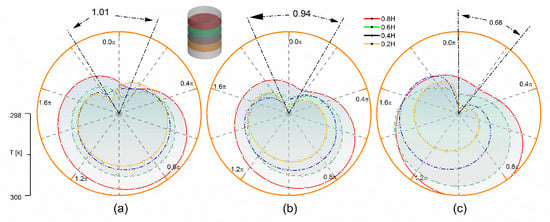 Since the thermocapillary force comes from the free surface, the temperature distribution on the free surface has important reference significance. In order to investigate the temperature variation on the free surface, four equidistant loops are selected on the free surface, as shown in Figure 11. The temperature at different positions on the free surface fluctuates in a small range, and the temperature of most regions varies from 298 K and 300 K. The results show that the temperatures of the loop lines at different locations are similar; that is, the high temperature area is concentrated on one side, while the low temperature area is concentrated on the other side. The position of the temperature minimum point at each height is different, and the temperature minimum point at each height has a stable phase difference. In most cases, the temperature near the upper disk is higher than that near the lower disk, but under the influence of thermocapillary convection, the temperature near the lower disk is higher in some places.