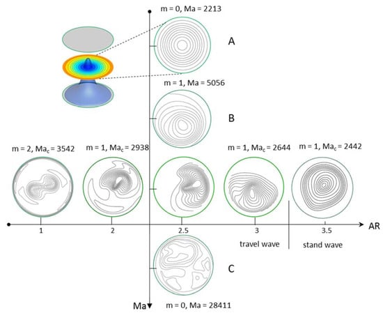 The results show that when AR is greater than 1, the transition sequence of thermocapillary convection with AR is as follows: traveling wave with wave number 2 > traveling wave with wave number 1 > standing wave with wave number 1. The transition sequence of thermocapillary convection with Ma is as follows: two-dimensional axisymmetric steady-state flow > thermal fluid wave > chaos. Figure 15 shows the flow regime transition regions for different Ma numbers and AR. It can be seen that the critical Marangoni number decreases with the increase in AR, and similar results are obtained in the experiment of Yano et al. [] under microgravity.