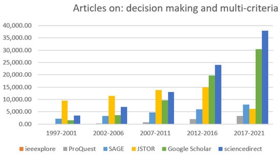 In Table 1, the periods 2007–2011 and 2017–2021 show an increase in publications. JSTOR was constant in its publications, but they decreased from 2017–2021. Meanwhile, ScienceDirect increased its content on the topics of decision making and multi-criteria.