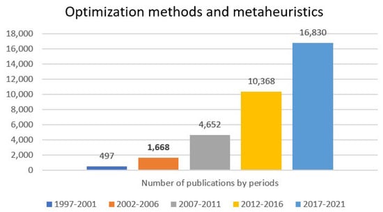 Subsequently, the topics of optimization methods and metaheuristics are sought, considering articles published in journals and book chapters between 1997 and 2021, in which it is once again verified that they are becoming increasingly important in the scientific community, due to the increase in publications (see Figure 4).