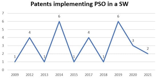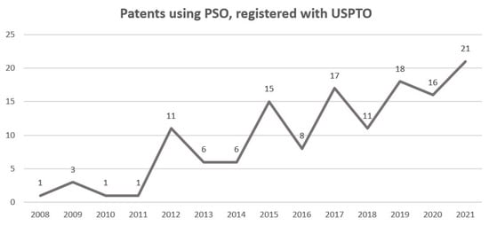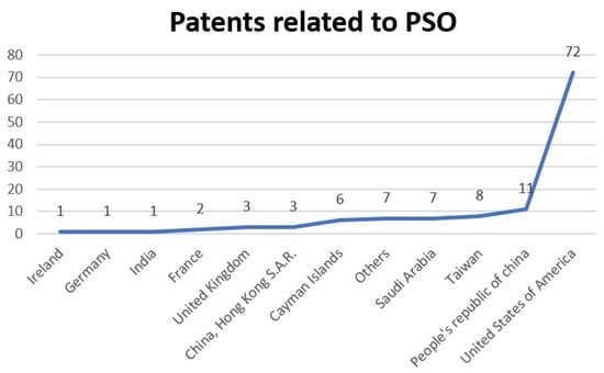 The importance that researchers are giving to PSO can be seen in the increase in patents. In 2021 alone, 21 patents with PSO were located, and within this group are the first patents from the countries of India, Ireland, and Germany (Figure 9).
