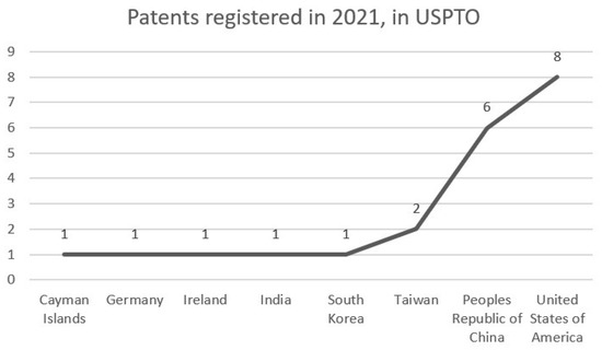 In these 29 patents, the US emerged as the topic leader until 2017 (Table 4). However, in the 2019–2020 period, the PRC has made significant progress, becoming the leader, although the US still has the highest number of patents. Thus, it can be concluded that, in recent years, the PRC has made great scientific advances with PSO, with the largest number of patents, and being the first to patent in 2021 (Figure 8).