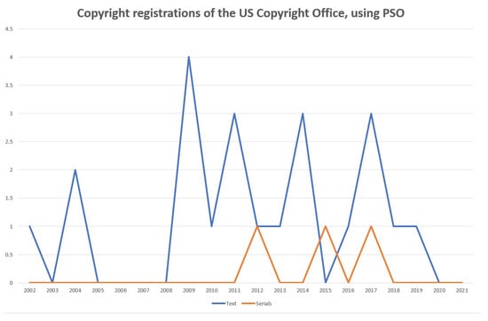 In Figure 10, there are two parameters: texts and strings. These are part of the registered literary works. The years with the most records were 2009 and 2017, but the number of copyrighted works was minimal compared to the number of scientific papers or patents using PSO.