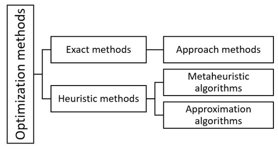 Figure 11 shows a classification that the authors visualize between exact and heuristic methods, where the exact methods give an optimal solution, while the heuristics compute the fastest result, getting closer to the optimal solution [67,69]. Among the heuristic methods are the approximation and metaheuristic algorithms, where their main difference lies in the number of iterations used in their process [49,66].