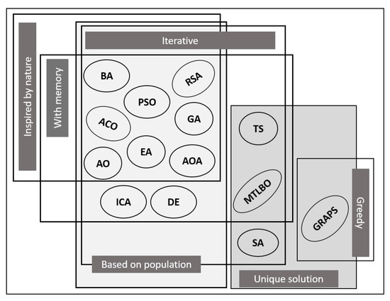 There is a wide variety of algorithms within metaheuristics, including novel algorithms and hybridization of several algorithms, which makes it difficult to determine which of them provides the most efficient solution [68,71]. That is why the authors have made four categories according to behaviors and characteristics, see Figure 12. These categories correspond to: (1) those based on unique or population solutions, (2) inspired or not by nature, (3) iterative or greedy, and (4) with or without memory.