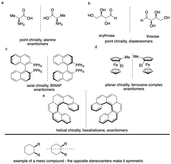 Molecules possessing features related to axial, helical [71], and planar [72] structure can also impart chirality in compounds that do not possess point chiral or stereogenic centers. Axial chirality is achieved when symmetry exists looking down an axis of a molecule; this commonly occurs in 2,2′-disubstituted biaryls and dissymmetrically substituted allenes. Examples of axial chirality include the organophosphorus compound, 2,2′-bis (diphenylphosphino)-1,1-binaphthyl), or BINAP [73] and 2,2′-dihydroxy-4,4′,6,6′-tetramethylbiphenyl. In both examples, axial chirality is due to restricted rotation as a result of steric hindrance (Figure 2c). Helical chirality is based on twisting in 3D space, as demonstrated in the aromatic compound hexahelicene (Figure 2d). Similar to axial chirality, steric strain promotes the existence of a stereogenic axis, giving rise to chiral forms in helically chiral structures. Planar chirality is a system where the 2D structures are not superimposable. They contain two dissymmetric, non-coplanar rings that cannot be easily rotated (e.g., metallocenes including ferrocene, Figure 2e).