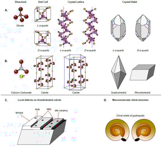 Summary of the variations of chirality of mineral crystals. (A) Inherent chirality, as observed in the unit cell with quartz as an example. (B) Chiral faces of achiral minerals with calcite as the example: the unit cell is achiral as is the crystal lattice; however, the crystal habit can have chiral faces, as observed with the scalenohedral habit, and the rhombohedral habit has no chiral faces. (C) Natural minerals have local defects that can result in local chiral centers. Shown are defects typical of a growing crystal structure. (D) Macromolecular mineralogical structures can have chirality. Often, precipitated shells of biological organisms have a chiral structure, such as the gastropod shells drawn here.