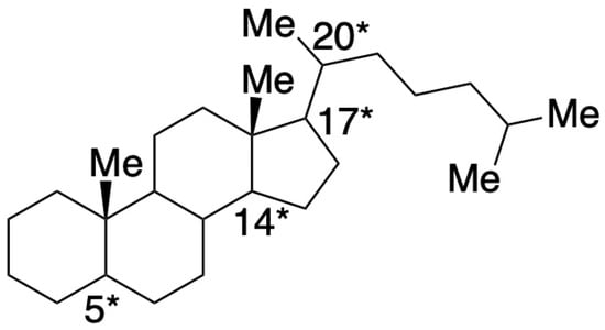 Structure of the C27 sterane, cholestane. The asterisk (*) at C-5, C-14, C-17, and C-20 indicate where a H can be in the α- or β-configuration, and the carbon at C-20 can be the R or S enantiomer. The R enantiomer is the biological form, whereas the S enantiomer is the geologically stable form.
