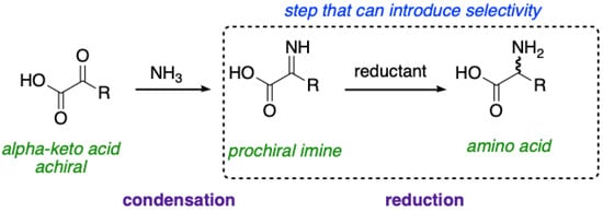 Asymmetric reactions relevant to the origins of life include reductive amination and Strecker synthesis for synthesizing amino acids and the autocatalytic formose reaction for synthesizing sugars (see Section 8.2.3 for more details). Asymmetric reactivity is very important in the field of organic chemistry, as it is often a key consideration in pharmaceutical and natural product synthesis [102,103]. Notably the 2021 Nobel Prize in Chemistry was awarded for the discovery of chiral organocatalysis [104]. There are a variety of catalytic methods to create asymmetry in reactions (Table 1). Some examples include organocatalysis that utilize chiral compounds (such as proline) as the catalyst, which then imparts asymmetry [105,106,107]. For metal-based catalysis, the chiral component can often be the ligand of the metal catalyst; such ligands can include organics with point or axial chirality [108,109,110]. However, there are other methods to impart chirality with the use of transition metals [111].