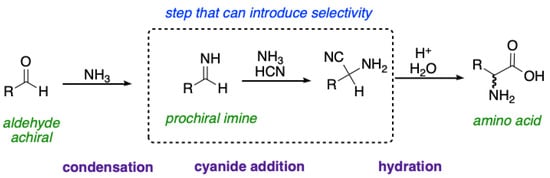 - Harada, K. Asymmetric synthesis of α-amino-acids by the Strecker synthesis. Nature 1963, 200, 1201. [Google Scholar] [CrossRef]