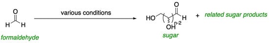 - Cleaves, H.J. Formose reaction. In Encyclopedia of Astrobiology; Gargaud, M., Irvine, W.M., Amils, R., Cleaves, H.J., II, Pinti, D.L., Quintanilla, J.C., Rouan, D., Spohn, T., Tirard, S., Viso, M., Eds.; Springer: Berlin/Heidelberg, Germany, 2011. [Google Scholar] [CrossRef]