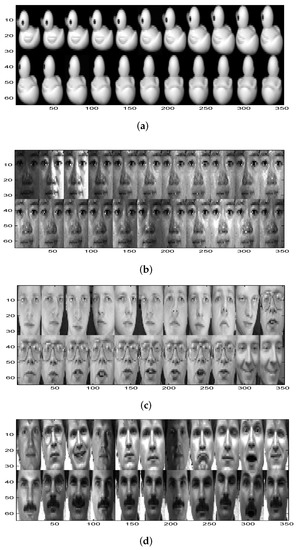 3. ORL (http://www.cad.zju.edu.cn/home/dengcai/Data/FaceData.html (accessed on 1 December 2021)): This dataset contains ten different images of each of 40 distinct subjects. For some subjects, the images were taken at different times, varying the lighting, facial expressions (open/closed eyes, smiling/not smiling) and facial details (glasses/no glasses). All the images were taken against a dark homogeneous background with the subjects in an upright, frontal position (with tolerance for some side movement).
