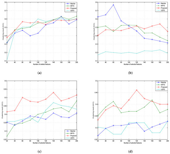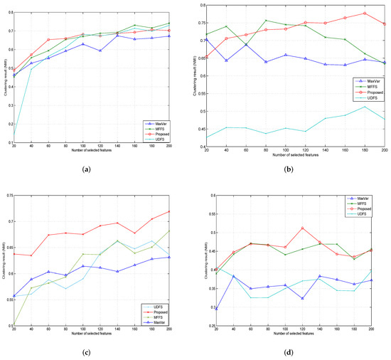 In Table 2 and Table 3, we report the best clustering accuracy and the best normalized mutual information, expressed as the number of selected feature changes. In Table 2 and Table 3, we can see that the performance of Algorithm 1 was more effective than that of the MaxVar Algorithm [22], the UDFS Algorithm [23] and the MFFS Algorithm [24] on all data sets, which shows the effectiveness and robustness of our proposed method.