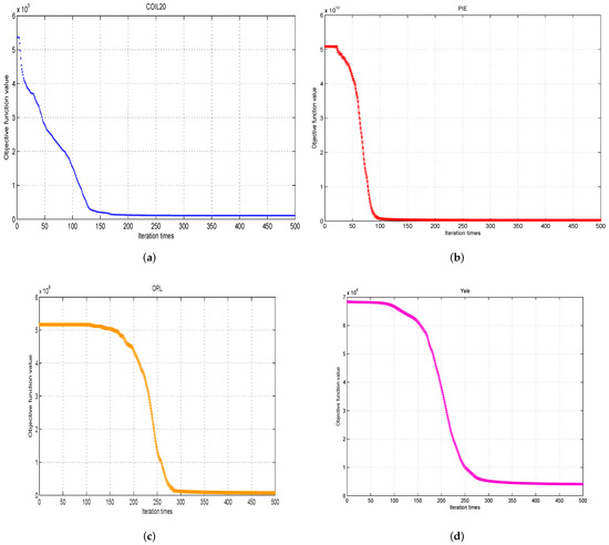 4. Yale (http://www.cad.zju.edu.cn/home/dengcai/Data/FaceData.html (accessed on 1 December 2021)): This dataset contains 165 grayscale images of 15 individuals. There are 11 images per subject, and they have different facial expressions (happy, sad, surprised, sleepy, normal and wink) or lighting conditions (center-light, left-light, right-light). Using the above four datasets, we input these grayscale images as the initial value A, and then used the initial matrix X and Y so that we could obtain a series of function values through the iterative updating of the algorithm. Then, we were able to obtain four convergence curves for different databases, as shown in Figure 2.