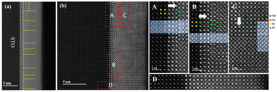 Furthermore, we can observe the oxygen columns from the inverted ABF images (shaded in Figure 1) around the edges of these RP faults. The slight elongation of Ni–O bonds along the z-axis at the plane of RP fault A is apparent (see also Figure S2b), which can result in a significant splitting of the eg level of the Ni 3d orbital and a relative variation in the O 2p level based on the Jahn–Teller effect [11]. From a layer-by-layer structural perspective [11], the distortion of oxygen anions toward the fault plane can reduce the strong repulsion between two [NdO]+ layers and achieve an energetically favorable structure. Around RP fault B, the elongation of Ni–O bonds is not clear, accompanying a visible distortion of [NiO6] octahedra (see Figure S3). The reduced contrast of oxygen columns is possibly due to the existence of oxygen vacancies. Additionally, we observe distinct oxygen columns at RP fault C without apparent changes in the oxygen structure. Owing to the overlapping of elements around the edge of RP fault C, we observe a homogeneous distribution of oxygen.