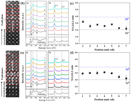 To investigate the effects of RP faults on the electronic character of the NNO film, we performed STEM-EELS measurements with atomic resolution. Figure 2a,d show the HAADF images of RP faults A and B, respectively. For the sake of improving the signal-to-noise ratio, the O-K and Ni-L2,3 edges were extracted from the red dashed boxes with a width of one unit cell shown in Figure 2b,e. From the NdNiO3 reference, we observe a strong pre-peak A at the O K edge, which is associated with the hybridization of O 2p and Ni 3d orbitals, reflecting the covalency of Ni–O bonding and the oxidation state of Ni [28,29]. The pre-peak of the O K edge is weak or even absent around the RP faults, which is related to the changes in the local Ni–O distances due to epitaxial strain and RP faults [28,30]. In addition, the strong Nd–O interaction in the rock-salt layer results in a distinct shoulder of peak C. Close to the STO–NNO interface, the intermixing of Ti into Ni causes the appearance of peak B that arises from the Ti 3d–O 2p hybridized states. Peak B almost disappears in cells 4–7. Peak C corresponds to the O 2p states hybridized with Sr 4d in STO or Nd 5d in NNO. Peak D is due to the O 2p states hybridized with Ni 4 sp and Nd 5p states [31]. The L3 and L2 peaks of Ni arise from excitation of electrons from the 2p3/2 and 2p1/2 core levels to the unoccupied 3d band, which is used to determine the valence state of the transition metal from the white-line ratio and chemical shift [28]. The slight variations in peak positions and crystal-field splitting observed in Figure 2b,e imply changes in the electronic structure of Ni for both types of RP faults. We quantified the white-line ratio, which is shown in Figure 2c,f. From the DigitalMicrograph database [32], we calculated the Ni3+ and Ni2+ references, which are expected to correspond to the fault-free NdNiO3 and NiO films. These are shown as black and blue dashed lines in Figure 2c,f, respectively. We observe that the L3/L2 ratio increases near RP-fault planes and in the fault-free NNO layers close to the STO substrate, suggesting a decreased valence of Ni. In the fault-free NNO layer (the seventh unit cell) far from the fault planes, the valence of Ni is close to 3+, as expected. The Ni L3/L2 intensity ratio in RP fault B is a little higher than that in RP fault A, indicating a lower valence of Ni around RP fault B.