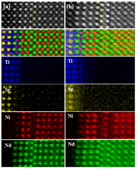 - Gauquelin, N.; Benckiser, E.; Kinyanjui, M.K.; Wu, M.; Lu, Y.; Christiani, G.; Logvenov, G.; Habermeier, H.U.; Kaiser, U.; Keimer, B.; et al. Atomically resolved EELS mapping of the interfacial structure of epitaxially strained LaNiO3/LaAlO3 superlattices. Phys. Rev. B 2014, 90, 195140. [Google Scholar] [CrossRef]