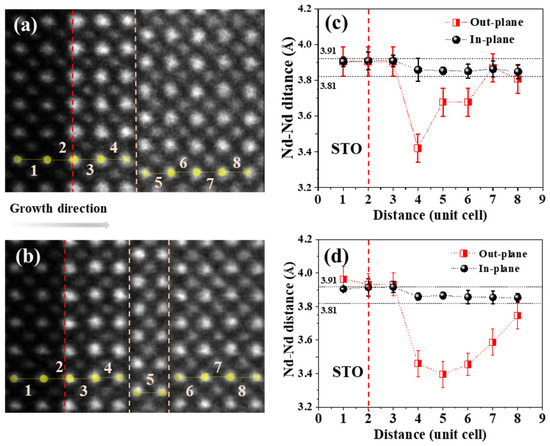 (a,b) HAADF images of RP fault A and B, respectively, used for the quantitative analysis of Nd–Nd distances. The numbers indicate the positions of unit cells. (c,d) The Nd–Nd distances along in-plane and out-of-plane directions across RP fault A and B, respectively. The red dashed lines indicate the STO–NNO interface. The orange dashed lines mark the fault planes.