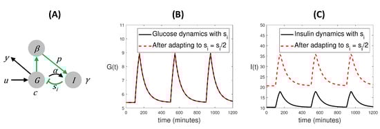 Interplay between SIO and adaptation in a system with symmetries. (A) Diagram of a glucose-insulin regulation circuit that keeps plasma glucose concentration within admissible levels. The model equations are given by (24)–(28). (B) Time-courses of glucose concentration over the course of three meals, before and after the system adapts to a change in parameter . The plot illustrates the phenomenon of dynamical compensation: both curves are exactly the same. (C) Lack of identifiability is linked to lack of observability: the two different values of yield two different insulin curves.