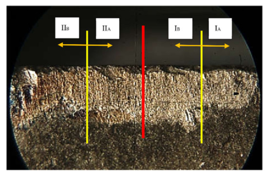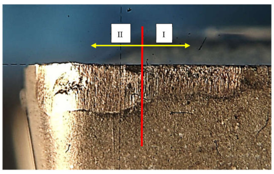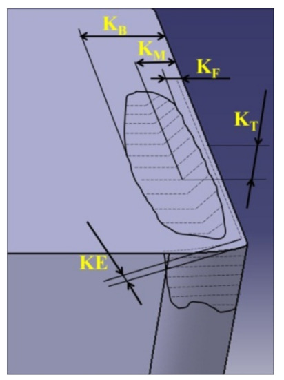 - Step 7. Position the vertical reticle of the microscope at the end of wear so that the measurements are made towards the tip of the cutting tool (in this way the nose radius of the cutting insert is avoided—Figure 14);