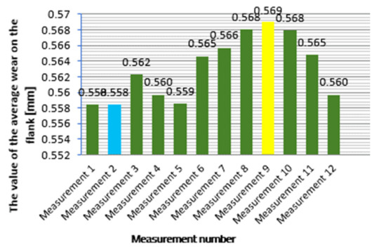 - The proposed methodology used to measure the flank wear of the cutting inserts with minimal errors, allows for the collection of results which can be compared between different researchers and can also be easily reproduced.