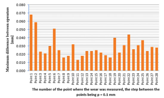 - maximum difference for the measured wear values by operators is 0.068 mm at point 1, which is understandable, being the first measurement; already when measuring the wear in point 2 the difference was reduced to 0.059 mm and then it returned to normal, the difference being as for the first operator, when 12 repetitions were performed;