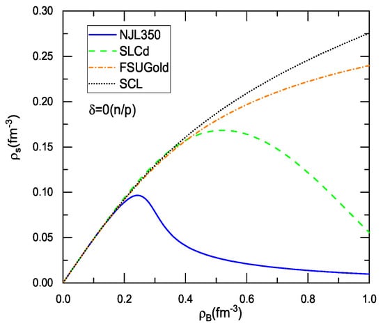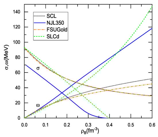 Figure 2 shows the scalar and vector fields for these models in the mean-field approximation. As shown in Figure 2, the scalar field with various models can group into two categories: one of which (NJL350 and SLCd) has a fast dropping in the medium, while the other (SCL and FSUGold) has a sluggish decrease. For the chiral models or models with the chiral limit, the scalar field plays a role of the order parameter that reflects the breaking vacuum and probes the chiral restoration in the medium. For the NJL model, the scalar field is, in fact, equivalent to the scalar condensate <>. A clear decrease of the scalar field with the NJL350 and SLCd indicates that these two models have the chiral limit in terms of the vanishing of the scalar field or scalar density (see Figure 1). The in-medium scalar field with the SCL behaves like that of the RMF model FSUGold, which means that the SCL that respects the chiral symmetry at the vacuum degenerates into a usual RMF model in the medium. As a result, the SCL is not able to restore the chiral symmetry in dense matter even at the sufficiently high density. This is also true for other extended linear- models, as it is not able to bring the scalar field down to vanishing in the medium [16]. The slowly varying scalar field also provides considerable attraction that softens the EOS at high density. Together with rather soft vector potential, the SCL and FSUGold are not able to meet the constraint of neutron stars. The situation with the NJL350 and SLCd is quite different by owning the stiff EOS’s at high densities and fitting the constraint of neutron stars [20,50,55].