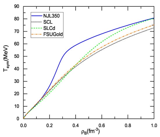 The scalar field that dictates the nucleon effective mass changes the kinetic symmetry energy (the kinetic part of the symmetry energy) which in the relativistic formulation is with being the Fermi energy. The decreasing nucleon effective mass in dense matter increases the clearly. As shown in Figure 3, the difference in the kinetic symmetry energy develops beyond saturation density, and it is the most appreciable for the NJL350. With the increase in density, the kinetic symmetry energy with the SLCd comes closer to that with the NJL350 because of the chiral limit of the SLCd. This is a direct evidence that the (partial) restoration of the chiral symmetry has a characteristic contribution to the symmetry energy, which stiffens the kinetic symmetry energy.