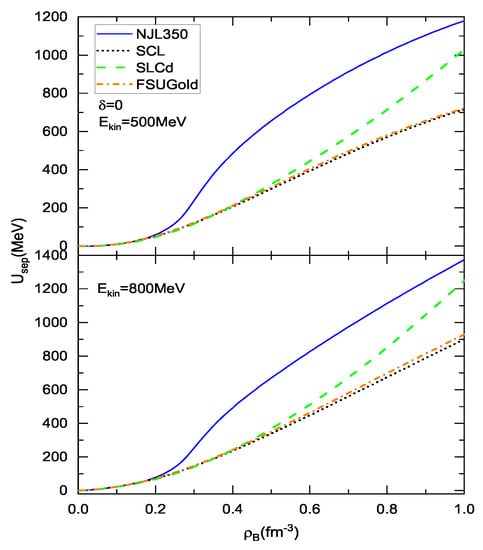 Note that the symmetry potential obtained with the models SCL and FSUGold is similar and also close at high densities, as shown in Figure 5. This is due to the fact that two models have similar nucleon scalar density (or, the nucleon effective mass). In the early time when the non-linear terms of the -meson self-interactions are introduced, it is known that the sign of the coefficient of the quartic term in non-linear RMF models is opposite to that of the models with the Mexican-hat potential. The situation has changed in the RMF models by including the non-linear self-interaction, which is the case of the FSUGold. The resembling model facet makes, at least partially, of the similarity in the symmetry potentials of the models SCL and FSUGold. It is also shown in Figure 5 that the symmetry potential obtained from various models overlaps around and below saturation density. The similar situation also occurs in the SEP (), shown in Figure 4. In the local density approximation, these optical potentials can, in principle, be translated into those for describing the high-energy proton-nucleus scattering, as the success of the RIA at high energies over that of the non-relativistic one is characterized by the spin dynamics specific in the RMF models [35,36,37]. The reasonable incompressibility in the current models, compared to the stiff one in the Walecka model, is important to produce the correct spin–orbit splitting of finite nuclei, which would lead to a better data fit in the RIA.