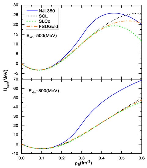With Equation (9), we can carry out the symmetry potential as functions of the density or kinetic energy. The symmetry potential is tightly related to the potential part of the symmetry energy [43,57]. Figure 5 shows the symmetry potential based on various models at and 800 MeV. Let us first focus on the result at MeV. We see again that the effect of the chiral restoration at the intermediate densities (by the NJL350) gives a very clear rise in the symmetry potential. As shown in the upper panel of Figure 5, the symmetry potential bends downwards at high densities, which occurs coincidentally in the models NJL350 and SLCd which share the chiral limit. As inferred from Figure 3 and Figure 5, the symmetry energy appears to be stiffer around saturation density with a larger slope parameter L for the chiral model which owns the chiral limit. It should be pointed out that the symmetry potential at high densities does not follow in a homeomorphic way the difference in the scalar density as those in Figure 3 and Figure 4. At high densities, there are trespassing between the symmetry potential curves that are subject to the different scalar densities or nucleon effective masses. The reason for this lies in the fact that the variation of the nucleon effective mass against the isospin asymmetry can be alternating in various regions of the nucleon effective mass, yielding the disorder in the SEP and symmetry potential for the nonzero isospin asymmetry. Such a disorder also appears in the higher density region ( fm) for the case of MeV. The difference between the lower and upper panels of Figure 5 in the depicted density region is attributed to the energy dependence of the NN scattering amplitudes. In particular, the RIA results with MeV actually include some contributions of the inelastic nucleon-nucleon scattering [45].