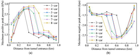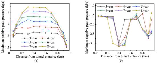 Figure 11 shows the distributions of three typical peak pressures (maximum positive peak, negative peak, and peak-to-peak pressures) along the longitudinal axis of the tunnel before the train tail left the tunnel. The x-axis represents the location of the monitoring point along the longitudinal direction of the tunnel, and the y-axis represents the typical peak pressures of the tunnel lining, such as positive, negative, and peak-to-peak pressure. For the maximum positive peak pressure, the effects of car number on the peak pressures near the tunnel middle section were greater than those near the tunnel portals. The peak pressure of the tunnel middle section increased with the increase in car number, and the increases in the peak pressures were approximately equal. The peak pressures of three- and four-car trains at the tunnel middle section compared with those of an eight-car train decreased by 11.4% and 8.7%, respectively. For the maximum negative peak pressure, the effects of car number on the peak pressures were irregular. The effects of car number on the peak pressures near the tunnel entrance were negligible. The peak pressures of three- and four-car trains at the tunnel middle section compared with those of an eight-car train decreased by 44.1% and 13.5%, respectively. The effects of car number on the maximum peak-to-peak and negative peak pressures were consistent.