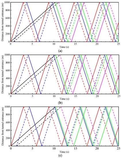 The wave diagrams for different car numbers are shown in Figure 16 for a single high-speed train traveling through a 1000-m-long tunnel at a speed of 350 km/h. The black solid and dotted lines denote the running path of the train nose and tail, respectively. The colored solid and dotted lines denote the compression and rarefaction waves, respectively. The first red and green solid lines denote the initial compression wave induced by the train nose at the tunnel entrance and exit, respectively. The first blue and magenta dotted lines denote the initial rarefaction wave induced by the train tail at the tunnel entrance and exit, respectively. The subsequent colored solid and dotted lines denote the reflected waves from the tunnel portals.