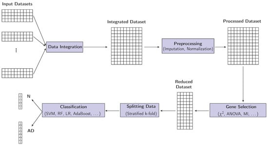 In this section, we introduce the proposed approach for GS and for AD classification, which is illustrated in Figure 1. The approach consists of four stages: integration of the datasets, preprocessing, GS, and classification. The details of the proposed approach are presented below.