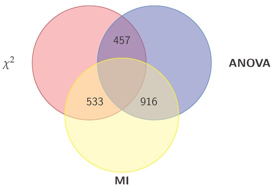 We found out that the highest performance was consistently that of the SVM model, when used with the 700 genes with the highest value, 1000 genes with the highest ANOVA (F statistic) value, and 1700 genes with the highest MI vlaue. Having identified these three sets of genes, we began to get their pairwise intersections, as per the proposed Algorithm, which are depicted visually in Figure 2. As can be seen, the intersection between the and ANOVA sets contains 457 genes, between ANOVA and MI contains 916 genes, and finally between , and MI contains 533 genes. Having obtained the pairwise intersections, we then obtained their union which contains 1058 genes. As can be seen from the bar charts, the 1058 genes of the subset represent the most relevant (producing the highest performance) for predicting AD by the SVM model.