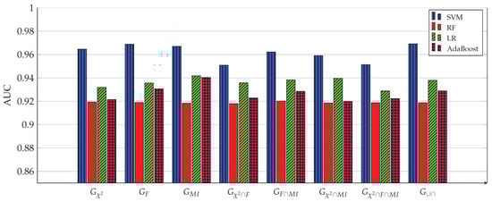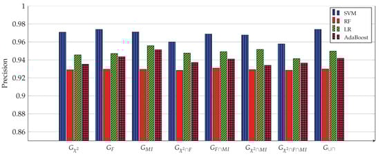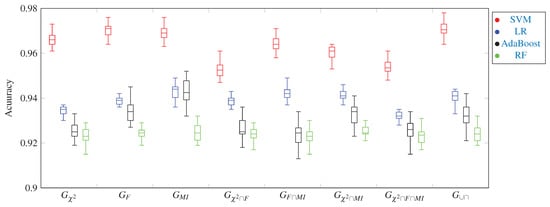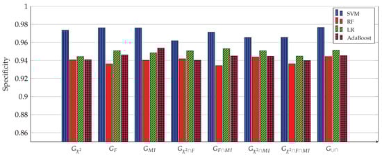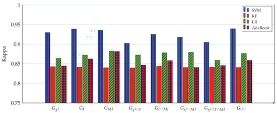 Figure 3, Figure 4, Figure 5, Figure 6, Figure 7 and Figure 8 show the results of the training/test phase for six metrics, sensitivity (recall), specificity, precision, kappa index, AUC and accuracy, whose equations can be found in any ML reference, see e.g., []. Each figure displays the values of this metric for for four classifiers, SVM, RF, LR and Adaboost, and eight gene subsets. As mentioned earlier, the training/test phase was carried out on only 1000 cases of the original dataset of 1157 cases. Further, in this phase, the testing was done using a repeated stratified k-fold approach, with and the number of repetitions equal 30, to ensure credible results. It is evident from the Figures that best performing classifier, the one with the highest values of the metrics, is the SVM classifier. It is also evident that the gene subset associated with this high performance is the subset, which contains 1058 genes out of an original number of 39,280 genes. For the box plot of Figure 8, we plotted the 30 accuracy values obtained from the 30 repetitions. The 10 results of the 10-fold in each repetition were first averaged, producing only one value, which was then considered the value of one repetition.
