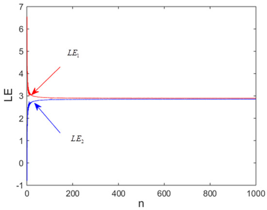 Exploiting the well-known Wolf algorithm [44], we have calculated and plotted the LEs of the proposed map (see Figure 3). An important observation is that the first and second LEs of the new map are both positive. Consequently, the attractors of the designed map can be classified as hyperchaotic attractors. Another important observation is that the Lyapunov exponents are stable at 2.9, and this value is high compared to some recent achievements with 2D maps, as indicated by Table 1.