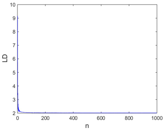 Kaplan and Yorke [46] were the first scientists to investigate the notion of the Lyapunov dimension (LD). In the last decade, various authors used this important concept to justify the complexity of numerous dynamic systems [47,48,49]. It should be known that the higher the LD of a map, the stronger its randomness. In this paper, we used the recent algorithm of Kuznetsov and collaborators [43] to compute the LD of the proposed hyperchaotic map (see Figure 4). From these results, it can be observed that the LD for the proposed hyperchaotic map was stable at 2 and this value is high compared to some recent achievements with 2D maps, as indicated by Table 1.