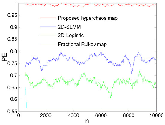 Considering a dynamic system, Permutation Entropy (PE) is a measure of the complexity of the attractors, and can be exploited to compare the complexity of the proposed map with some recent maps. It should be noted that the highest value (threshold) of the PE defining the highest complexity of the map is 1 [38,39,40]. In this section, we exploited the computation algorithm proposed by [50] to compute and plot in the same graph the PE of the proposed maps with the PE of some recent maps. From the results presented in Figure 5, the PE of the presented hyperchaotic map was greater than that of some recent maps, indicating the very high complexity of the attractors of the proposed map.