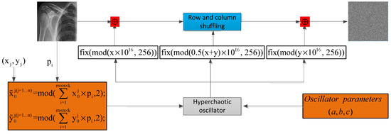 Step 1: Select the initial values () for solving the presented compound hyperchaotic map. Construct new initial conditions based on the following transformation: