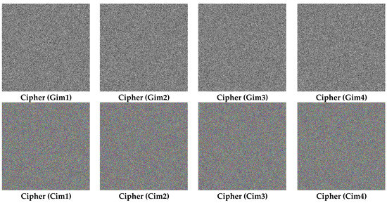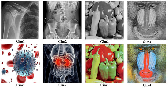 To assess the performances of the presented image encryption/decryption protocol, simulations were executed on a working environment containing an Intel Core™ i7-3630QM, 2.40GHz processor, 16GB RAM, and MATLAB R2014a. The images dataset consisted of eight 512 × 512 images—four color images labeled as Cim1, Cim2, Cim3, and Cim4 and four greyscale images labeled as Gim1, Gim2, Gim3, and Gim4 (see Figure 7)—retrieved from various medical image sources including the COVID-CT database [41] which is the most important database of COVID-19 Computed Tomography (CT). To solve the hyperchaotic map, the initial values were selected as x1 = 1, y1 = 1, a . From the results of this figure, it can be observed that the encrypted images were unreadable. To further validate these results, we evaluated the Peak Signal to Noise Ratio (PSNR):