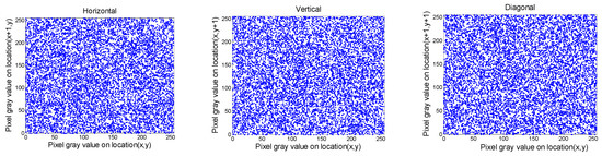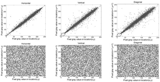 where ax, bx indicate the bordering pixels. The outcomes of Crab are provided in Table 4 and Table 5. The distribution of Crab for Gim2 and Cim2 images are plotted in Figure 8, Figure 9, Figure 10 and Figure 11, respectively. It is evident from the outcomes in Table 4 and Table 5 that the values of Crab for the input data always approach 1, and those of the output images tend to be zero. In addition, from the plots presented in Figure 8, Figure 9, Figure 10 and Figure 11, we can observe that the bordering pixels of the input images were linearly distributed. In contrast, the bordering pixels of the output images were randomly distributed. From these observations, it is obvious that any cryptanalyst could break the algorithm based on statistical analysis.