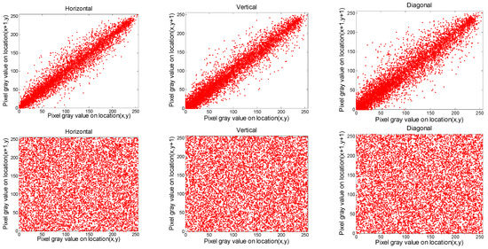 Distribution of two neighboring pixels of the red component for Cim2 image, where the first and second rows denote the original and ciphered image, respectively.