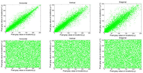 Distribution of two neighboring pixels of the green component for Cim2 image, where the first and second rows denote the original and ciphered image, respectively.