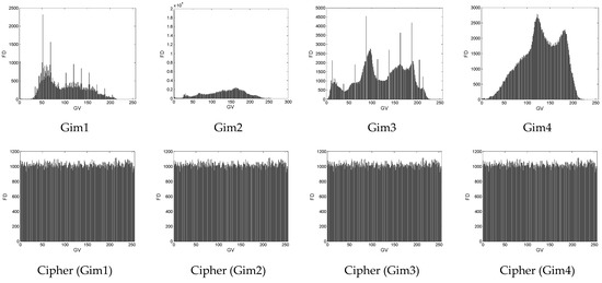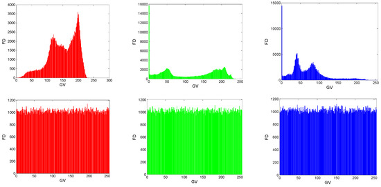 To evaluate the distribution of pixels in an image, a histogram test is usually applied. A histogram of images represents the frequency distribution of pixels [17,52]. For a plain image, the histogram is randomly distributed while a good encryption protocol provides cipher images with a uniformly distributed histogram. In the latter case, the proposed encryption protocol is robust to statistics-based attacks. Figure 12 shows the histograms of the selected grey-scale images which were randomly distributed, whereas Figure 13 shows the histograms of a color image (Cim3) which was uniformly distributed. Consequently, the proposed encryption protocol was robust to statistical attacks.