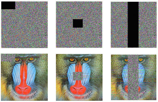 Noise usually affects images during the acquisition steps or transmission in the communication channel [56,57]. This paragraph is devoted showing that the present encryption protocol can withstand various forms of noise attack. To achieve this goal, an amount of noise was included in the encrypted images and the decryption process was exploited to recover the meaningful information from the noisy encrypted data. The results are presented in Figure 16 and the first row shows three images obtained with salt and pepper noise parameters 0, 0.02, and 0.5, respectively. The second row shows three images obtained with Gaussian noise parameters 0, 0.02, and 0.2, respectively. It is observed that the decrypted data are visually discernible with less error. With these observations it is obvious that the presented encryption protocol can resist noise attacks.