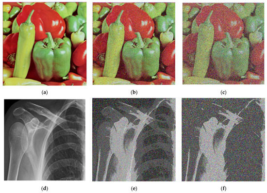 Outcomes of noise analysis: (a) without noise; (b) with 0.02 salt and pepper noise; (c) with 0.5 salt and pepper noise; (d) without noise; (e) with 0.02 gaussian noise; (f) With 0.2 gaussian noise.