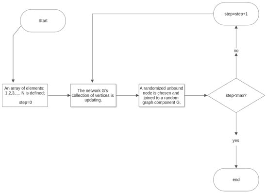 The algorithm is essentially a step-by-step growth of the graph G. At each step, one vertex is added, which is connected by an edge to a random vertex of the graph until the maximum number of steps is reached. The algorithm of simulation of randomized networks that grow is shown in Figure 1.