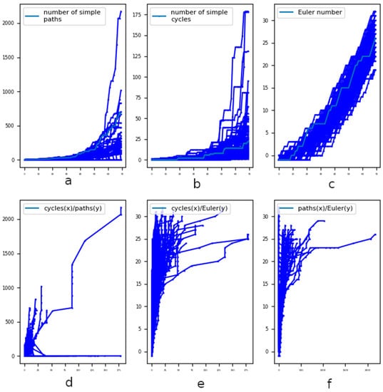 As can be seen from Figure 3, all processes are explosive-like, or a similar nature. Figure 2a,b shows a sharp exponential growth in graph dynamics. This growth is due to the growth in the number of simple paths and, at the same time, simple cycles. In Figure 3c the growth of the Euler number has a different character. In the bottom row of Figure 2, you can also pay attention to the explosive growth of dynamics. Here we display the relationship between the variables to each other: this is the Euler number, the number of simple cycles and the number of simple paths. Thus, almost any described algorithmic process is associated with explosive dynamics. This dynamics is considered by us as a complication of the structure of neural networks in the process of natural evolution.