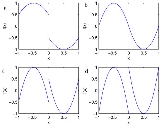 where denotes the neuron’s internal state at time t, denotes the neuron’s output at time t, is the coherent parameter indicating the coupling strength, is a piecewise logistic chaotic map with bifurcation parameter and is shown in Figure 1a. It can be seen that the curve of the bimodal mapping has two extreme points in its domain. When , it is discontinuous and jumps at . When , it is continuous for , so that the function is ergodic in the interval . When , it is decomposed into two independent quadratic function images, each with a top, indicating that no matter how x is evaluated, the function can be searched twice on the top, which is the fundamental reason why the piecewise logistic map (2) is superior to the logistic map, based on the fact that Ishii once pointed out that bimodal mapping has better performance than single-modal mapping for information processing applications of the GCM networks.