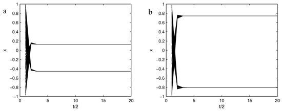 If is kept unchanged and is reduced, the network jumps into the 2-cycle and 2-cluster state, as shown in Figure 4. Moreover, it can be seen that the network’s coupling characteristics weaken with decreasing so that the two clusters separate from each other, and when , the two clustering points are close to and 1, respectively. In addition, when positive and negative ratios of the initial value are fixed, the change of the initial value does not affect the periodic orbit of the network. When the positive and negative ratio changes, only the sign of the cluster point changes, for example, given , the orbit was when the positive and negative ratio was 60:40, and it changed to when the positive and negative ratio was 40:60.